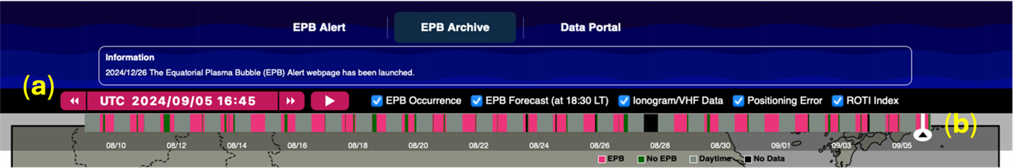 This is a manual on how to use the EPB Archieve webpage. Users can browse the EPB occurrence and data from 2024 until present using the timebar (a). Slidebar (b) enables users to browse the EPB occurrence and data up from the previous 28 days up to the selected date and time. The pink, green, gray and black color on the slideshow bar indicate EPB event, no EPB event, daytime and no data, respectively.