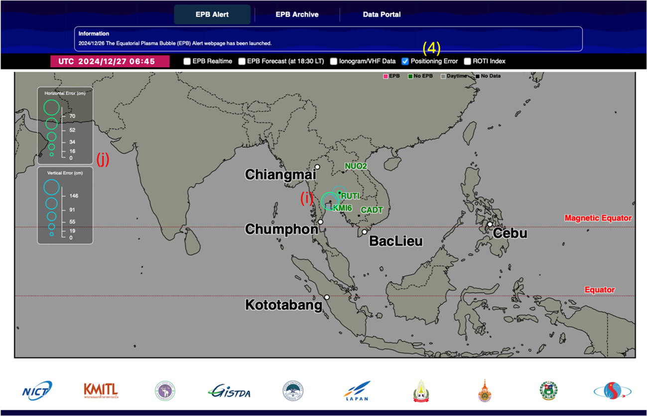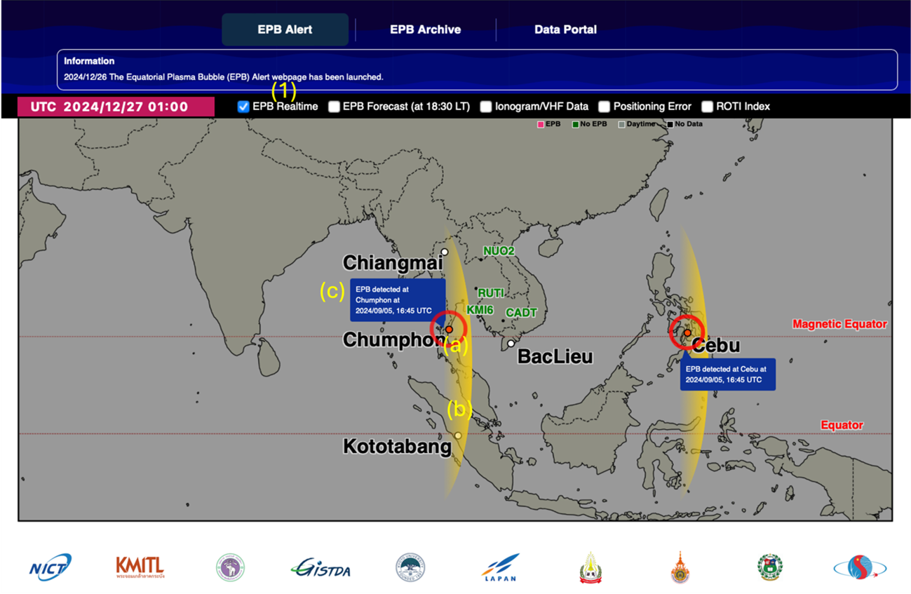 Click on (1) the EPB Realtime checkbox (ON by default) to display the information of the realtime EPB alert. The alert is displayed over 5 SEALION stations (Bac Lieu, Cebu, Chiang Mai, Chumphon and Kototabang). If there is an EPB event, a flashing red circle alert (a), EPB cresent-shaped icon (b) and text bubble showing the details information (c) will be displayed over the station that observes the event as shown in Figure 2.