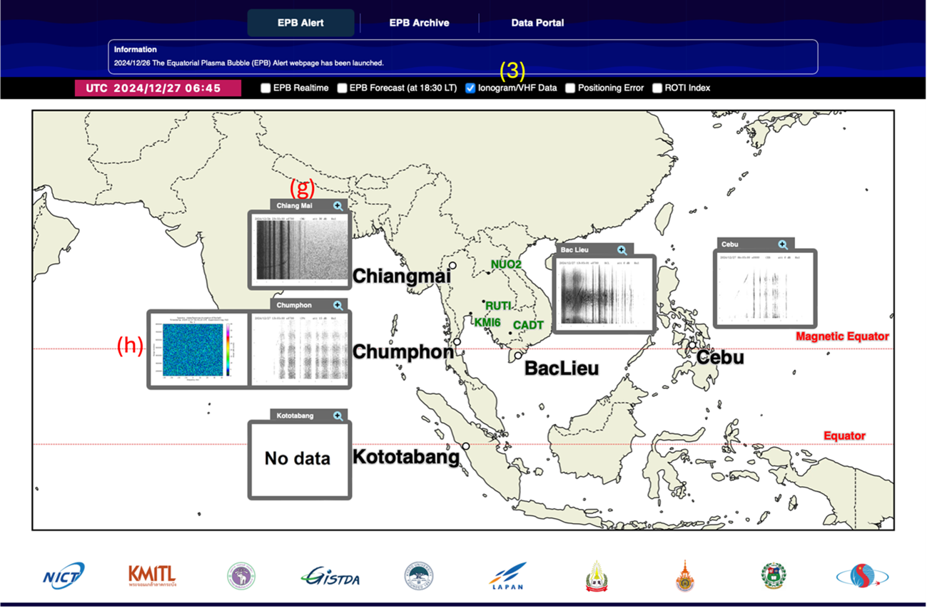 Click on (3) the Ionogram/VHF data check box. Ionogram image (g) from 5 stations (Bac Lieu, Cebu, Chumphon, Chiang Mai and Kototabang) and VHF radar from Chumphon (h) will be displayed with 15 mins interval. Click the image to enlarge it.