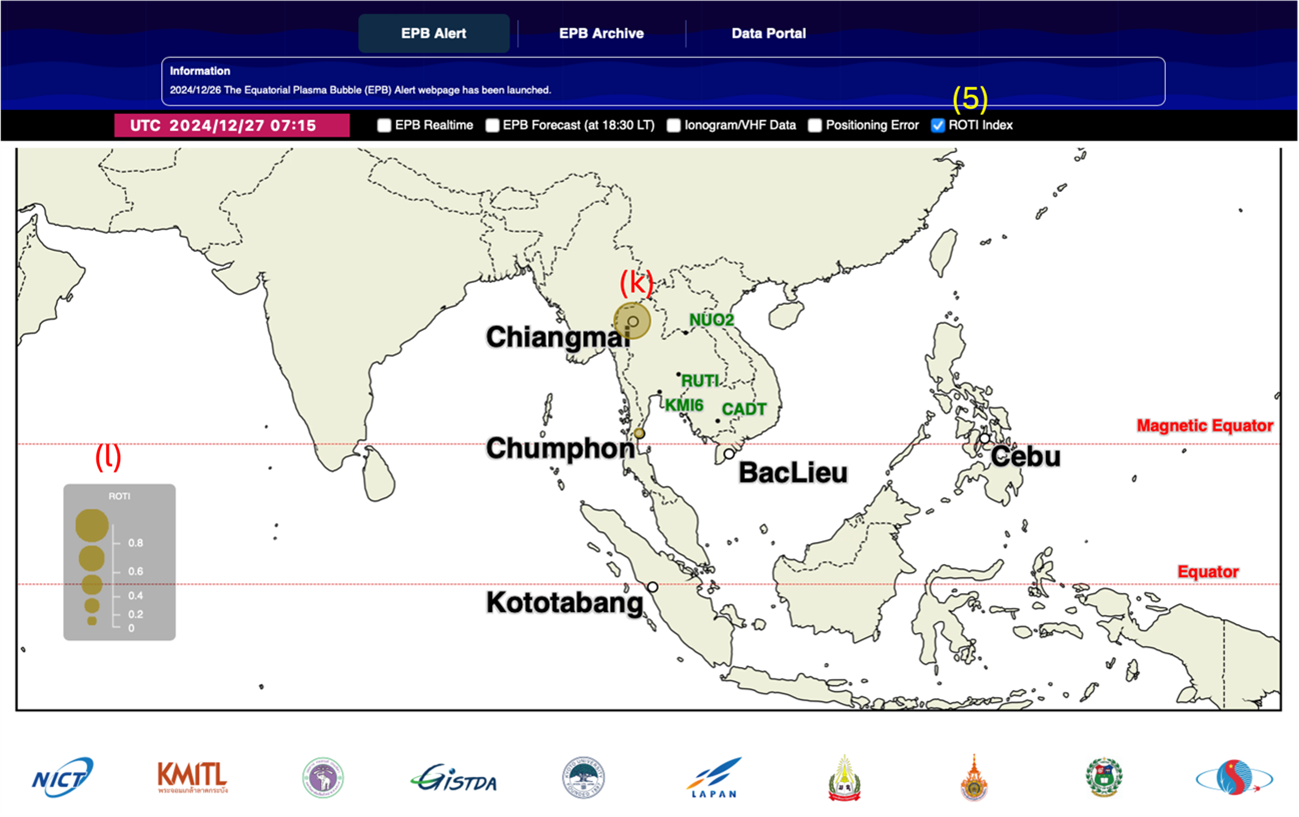 Click on (5) the ROTI index checkbox, dark yellow (k) circle will appear in the station that have the ROTI index data. The legend (l)shows the different circle sizes correspond with the value of the ROTI index ranging from 0-1.